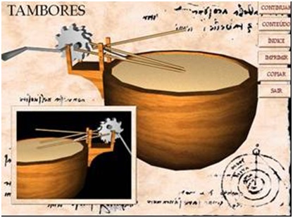 Na figura acima, observamos a imagem de um tambor em 3D que pode ser manipulado pelo interator sob vários ângulos, levando a uma experiência estética no sentido da manipulação e da audição uma vez que podemos "tocar" o instrumento virtualmente durante a exploração da hipermídia.