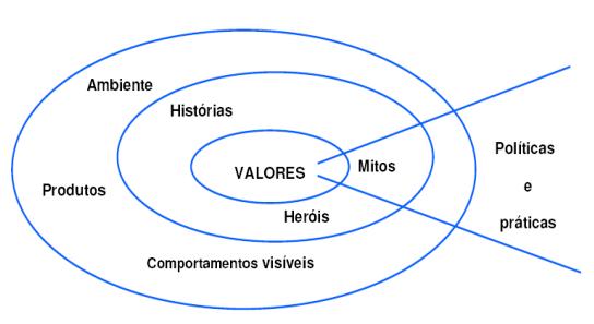 Por meio da metáfora, pode-se observar que os elementos mais facilmente identificáveis constituem a camada externa; os mitos, valores e heróis constituem uma camada intermediária; no centro, encontram-se os valores da organização.