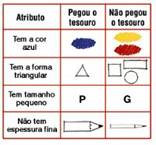 Nesse ponto, começa o jogo com as crianças. Peça que cada uma escolha um bloco lógico. Ao observar as peças sorteadas, escolha uma delas sem comunicar às crianças qual é. Ela será a chave para descobrir o "marujo" que está com o tesouro. Apresente então um quadro com três colunas (veja abaixo). Supondo que a peça escolhida seja um triângulo pequeno, azul e grosso, você diz: "Quem pegou o tesouro tem a peça azul". Pedindo a ajuda das crianças, preencha os atributos no quadro. Em seguida, dê outra dica: "Quem pegou o tesouro tem a forma triangular". Siga até chegar ao marinheiro que esconde o tesouro. A atividade estimula mais que a comparação visual. Também exercita a comparação entre o atributo, agora imaginado pela criança, e a peça que a criança tem na mão. A negação (segunda coluna do quadro) leva à classificação e ajuda a compreender, por exemplo, que um número pertence a um e não a outro conjunto numérico.