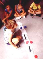 As crianças vão transformar uma peça em outra seguindo uma seqüência de comandos estabelecida pelo professor. Esses comandos são indicados numa linha por setas, combinadas com atributos. No exemplo da foto, vemos uma seqüência iniciada com os atributos círculo, azul e grosso. As crianças então escolhem a peça correspondente. O comando seguinte é mudar para a cor vermelha. As crianças selecionam um círculo grosso e vermelho. Em seguida, devem mudar para a espessura fina. Então, um círculo vermelho e fino é selecionado. Assim por diante, o professor pode continuar acrescentando comandos ou pode apresentar uma seqüência pronta. Depois é feito o processo inverso.