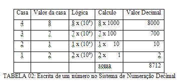 Partindo do valor unitário e multiplicando este valor 1 pela base do sistema (10), obtemos 10 e aumentamos uma casa. Se multiplicarmos o valor obtido novamente pela base do sistema (10 x 10), obtém 100 e novamente uma casa é adicionada. E assim sucessivamente. Tomemos como exemplo o número 54. É muito fácil e quase instintivo avaliar esta grandeza mas, como é que nosso cérebro "percebe o número 54" E, num passo adiante, como é que o computador lida com este número? Precisamos desmembrá-lo para obter a resposta. Por exemplo, vamos trabalhar com o número 8712, conforme descrito na Tabela 02.