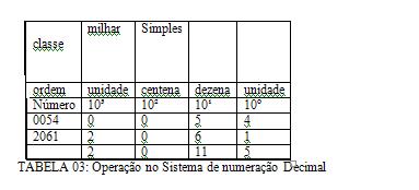 O desmembramento do 2061 seria logicamente 2x(10³) + 0x(10²) + 6x(10¹) + 1x(10º). Note que para cada casa existe sempre um (e apenas um) dígito. Se fizermos uma adição com os números desmembrados, por exemplo, somar 54 a 2061, obteria o resultado constante na Tabela 03: