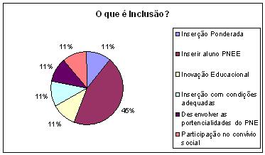 Com base nos dados coletados conforme mostra o gráfico 1 a maioria dos educadores acreditam que a inclusão é desenvolver as potencialidades do PNEE, ou seja, trabalhar suas potencialidades na escola. Porém, para Sassaki (2002) a inclusão é um processo de mudança do sistema social comum para acolher toda a diversidade humana. Também esteve presente dentre as respostas que a inclusão é a inserção ponderada, inovação educacional e a participação do convívio social dentre outras.