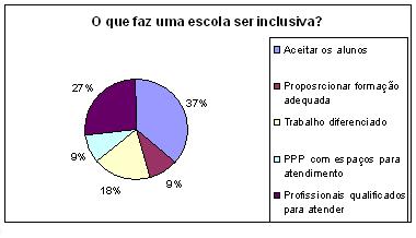 O segundo questionamento abordado nesta pesquisa procura evidenciar através do gráfico 2 o que faz uma escola ser inclusiva. Para 37% dos entrevistados, a escola torna-se inclusiva quando aceita todos os alunos, seguida de 27% dos que acreditam ser necessário uma formação adequada. As respostas dos entrevistados são confrontadas com o pensamento de Facion (2005) o qual acredita que uma escola só poderá ser chamada de inclusiva quando sofrer algumas adaptações concretas desde a educação infantil das quais a mais importante a salientar é o respeito à individualidade da criança. Para este mesmo autor, não basta apenas à boa vontade mas sim é de grande necessidade um trabalho em conjunto com todos os envolvidos neste processo.