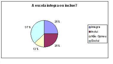 O último questionamento abordado neste eixo o qual acreditamos ser de grande importância, busca saber se as escolas incluem ou integram. Acreditam os entrevistados que 37% das escolas "excluem' os alunos PNEE, seguidos de 25% integradoras e 25% inclusivas. De acordo com Carvalho (2007) , a exclusão está presente em todos os processos de nossa sociedade e é muito visível através de preconceito e discriminação.
