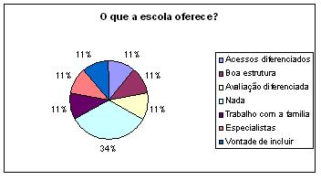 O presente gráfico apresenta os recursos que a escola oferece para os educadores trabalharem com as crianças especiais. Dos profissionais entrevistados demonstrados no gráfico 8, 34% relatam que as escolas não possuem recursos para atender esta demanda, seguidos de 11% que relatam ter acesso diferenciado, boa estrutura, trabalho com a família, especialistas, avaliação diferenciada e boa vontade. Neste eixo acreditamos ser de grande importância ressaltar que o primeiro passo para tornar-se uma escola inclusiva é contarmos com recursos tanto materiais quanto profissionais, visto que somente desta maneira poderemos realizar um trabalho qualificado focando-se no desenvolvimento das potencialidades de cada aluno.