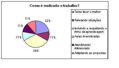 A apresentação do gráfico 5 buscou investigar como é realizado o trabalho em sala de aula, 34% dos entrevistados relatam ser de respeito ao ritmo de aprendizagem de cada um , seguidos de 22% que se dispõe fazer o melhor possível e 11% adaptam as propostas, relevam situações, atendem de forma diferenciadas e ministram aulas diversificadas. Baptista (2009) atenta que o trabalho docente na escola deve valorizar as características do aluno em seu contexto social, pois todas as crianças tem direito a educação, conforme consta na própria Declaração de Salamanca.