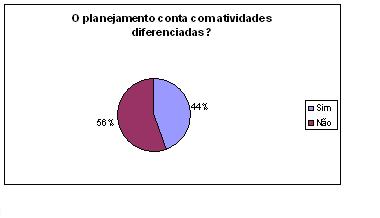 O gráfico 6, demonstrado acima questiona acerca de saber se o planejamento possui atividades diferenciadas, 56% dos entrevistados relatam não trabalharem de forma diferenciada e 44% proporcionam atividades diferenciadas aos seus alunos. Facion (2005) relata que o professor deve ensinar aquilo que o aluno necessita e não o que ele pensa que ele precisa. O autor acredita que o maior preconceito existente nas escolas é tratar igualmente aquele que não é igual. Quando nos remetemos ao ensino igualitário a todos estamos falando em atender os educandos da mesma forma, porém, cabe ressaltar que isto não significa que todos tem de aprender do mesmo jeito e com o mesmo ritmo (tempo), cada um de nós possuímos potencialidades e capacidades distintas o que nos fazem seres únicos.