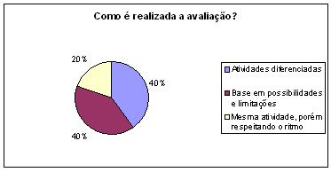 O último questionamento deste eixo procurou investigar como é realizada a avaliação destes alunos. Mesmo não achando-se preparados para atender esta demanda de alunos, 40% dos educadores dizem avaliar os alunos baseado em suas potencialidades e limitações, 40% dizem realizar atividades diferenciadas. E os demais 20% dizem aplicar a mesma avaliação porém respeitando o ritmo de realização das tarefas de cada um.