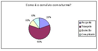 O nono gráfico demonstra um fato muito relevante no processo inclusivo, pois, ele aponta como é o convívio destes alunos especiais com a turma. Dos entrevistados 60% dizem ser bem tranqüilo, seguidos de 20% que tratam os colegas com respeito e 10% excludente e complicado. Para Mantoan (1997) o convívio da turma pode ser considerado um grande fator excludente e de isolamento dos alunos especiais dentro das instituições, a maneira que estes são tratados pelos demais, muitas vezes os fazem sentirem-se minimizados por não serem "iguais" diante desta situação cabe refletirmos de que maneira estamos trabalhando o processo inclusivo na escola evidenciando sempre que todos nós somos seres diferentes dotados de características e potencialidades únicas, sendo assim não podemos ser iguais.