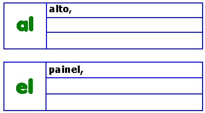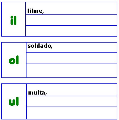 Procedimento: Pesquisar e escrever palavras com al, el, il, ol, ul, como nos exemplos.