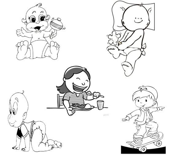 AS PESSOAS REALIZAM MUITOS MOVIMENTOS. PINTE OS DESENHOS ABAIXO QUE INDICAM O QUE VOCÊ FAZIA QUANDO AINDA ERA UM BEBÊ.